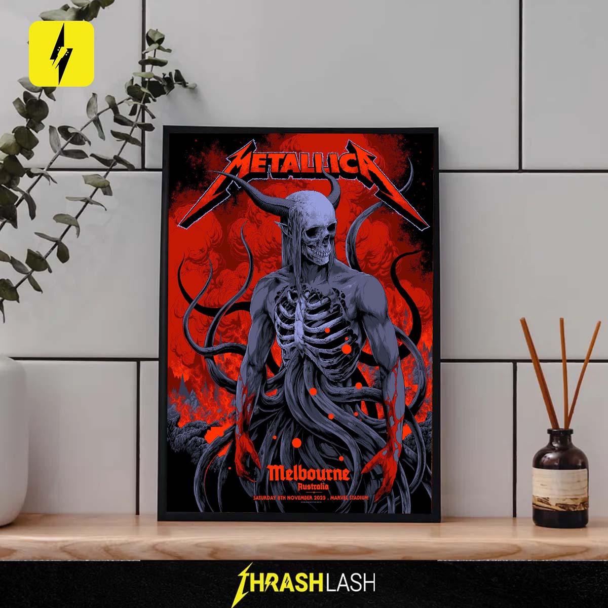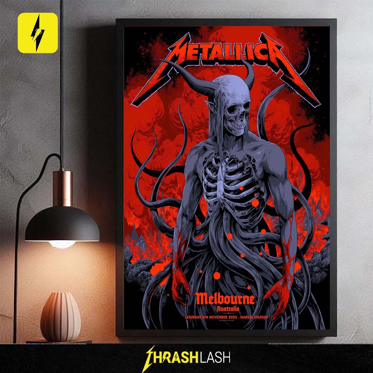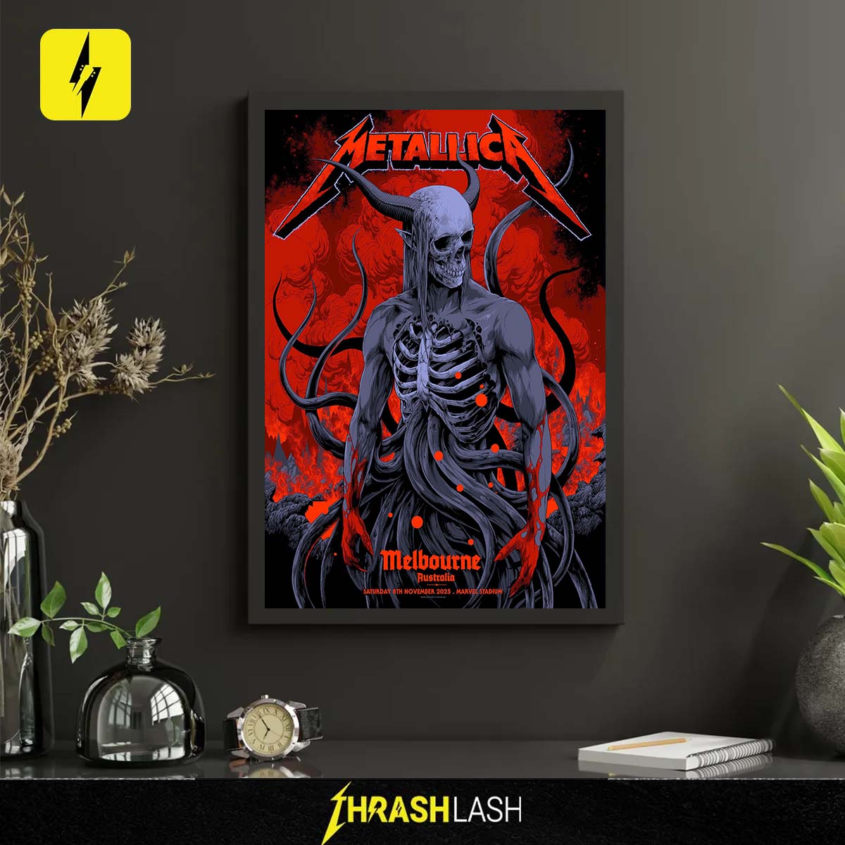 Originally available only at Metallica’s Melbourne Pop-Up Shop, this rare poster stands as a collector’s centerpiece — a perfect fusion of sound, art, and legacy. Available now in poster or gallery-wrapped canvas format, only at Thrashlash.com.